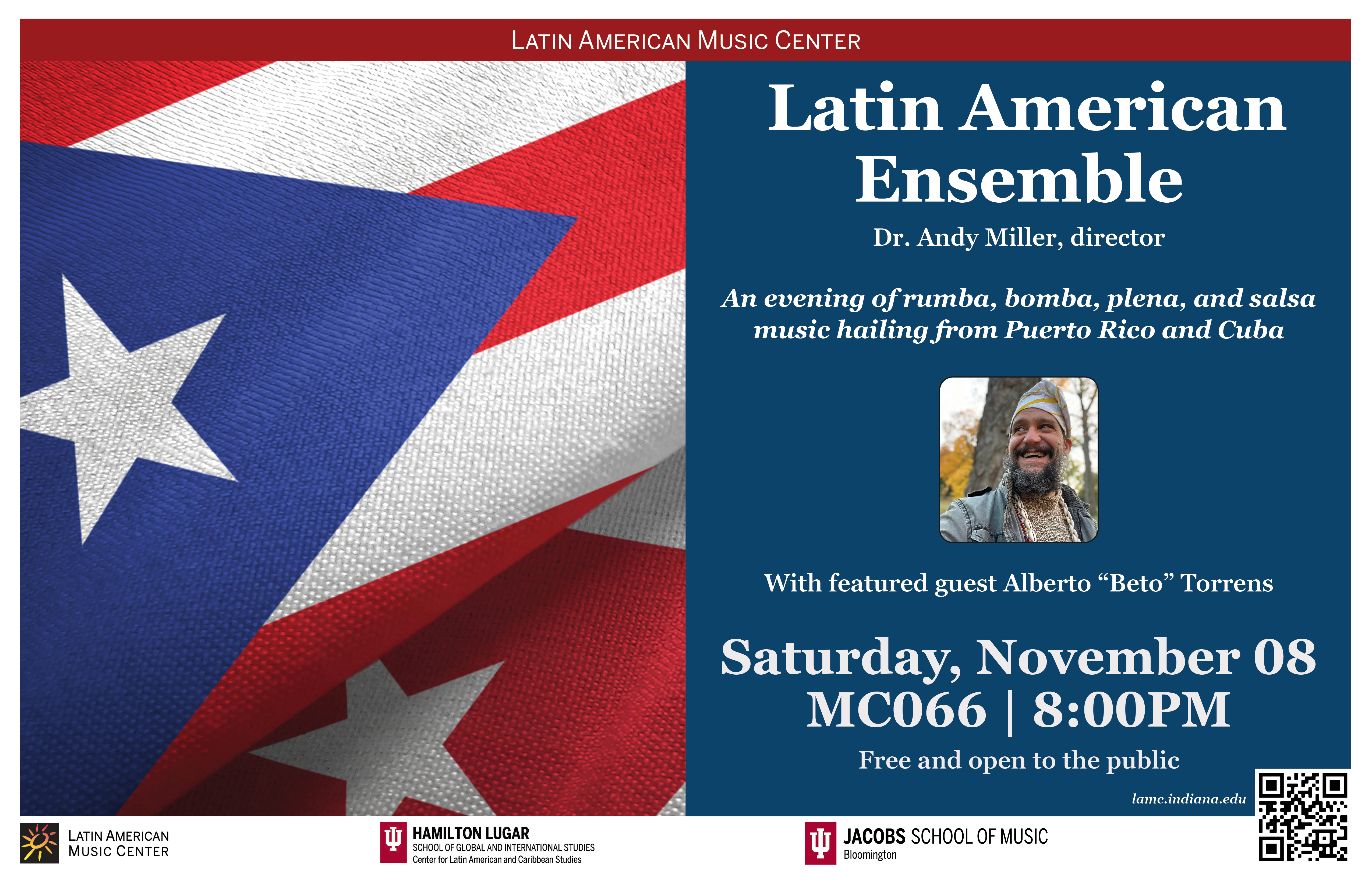 The Latin American Ensemble will perform and evening of music hailing from Cuba and Puerto Rico. The concert will highlight the percussion traditions of Cuba through the rhythms and songs of Palo and Rumba, led by guest artist Beto Torrens. Continuing to trace the influence of Bambula in the Caribbean, the ensemble will perform Afro-Puerto Rican Bomba songs set to the rhythms of Sicá, Yubá, Holandé, and Seis Corrido. The concert will end with a set of salsa and plena music featuring music by Cuban and Puerto Rican icons such as Eddie Palmieri, Cheo Feliciano, Orquesta Aragón, Rafael Cortijo, and Ismael Rivera.
